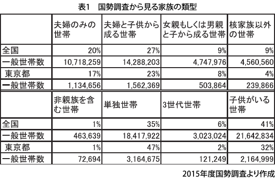 2015年の国勢調査で「世帯の家族類型」を見てみると、世帯総数は約5,333万世帯。これを100世帯の村だったとして見てみると、日本における家族構成の実態がわかります(表1)。