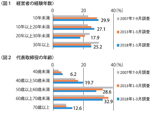 代表取締役の年齢については、2007年調査は「50歳以上60歳未満」が最も多く4割近い回答(39・6%)がありましたが、2013年調査は32・9%、今期は28・6%と減少しています。逆に50歳未満の割合は増加しています。一方で「70歳以上」の割合は今期が一番多く(8・4%→8・6%→12・6%)、事業承継が進んでいる企業と、承継せずに経営者の高齢化が進んでいる企業と二極化していることが予想されます(図2)。