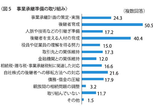 事業承継の準備としてどのような取り組みをしているかについては、「後継者育成」が最も多く(50・5%)、「後継者を支える人材の育成」が40・4%と続き、「事業承継計画の策定・実施」と回答した企業も24・3%ありました(図5)。