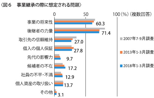 事業承継の際に想定される問題はどのようなことがあるかについて、主な項目を3つ選択する設問では、「後継者の力量」71・4%、「事業の将来性」60・3%、「借入の個人保証」27・8%、「取引先の信頼維持」27・0%と続き、「候補者の不在」は17・2%となりました(図6)。