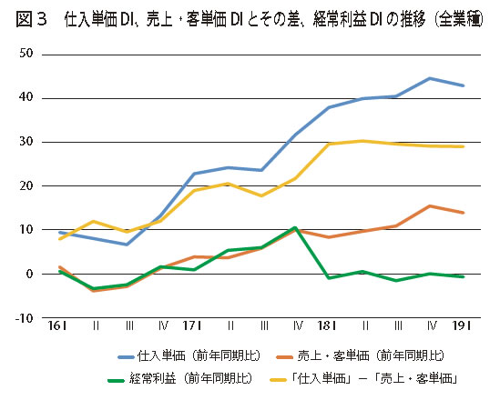 売上高DI(「増加」-「悪化」割合)は7→5、経常利益DI(「増加」-「悪化」割合)は0→△1と今期は悪化基調となりました。仕入単価DI(「上昇」-「下降」割合)は45→43とわずかに緩和されましたが、高止まり傾向が続いています。売上・客単価DI(「上昇」-「下降」割合)15→14で価格差に大きな変化はなく、1人当たり売上高DI、1人当たり付加価値DI(いずれも「増加」-「減少」割合)6→6、3→1と横ばい、悪化となり、採算悪化が懸念されます(図3)。