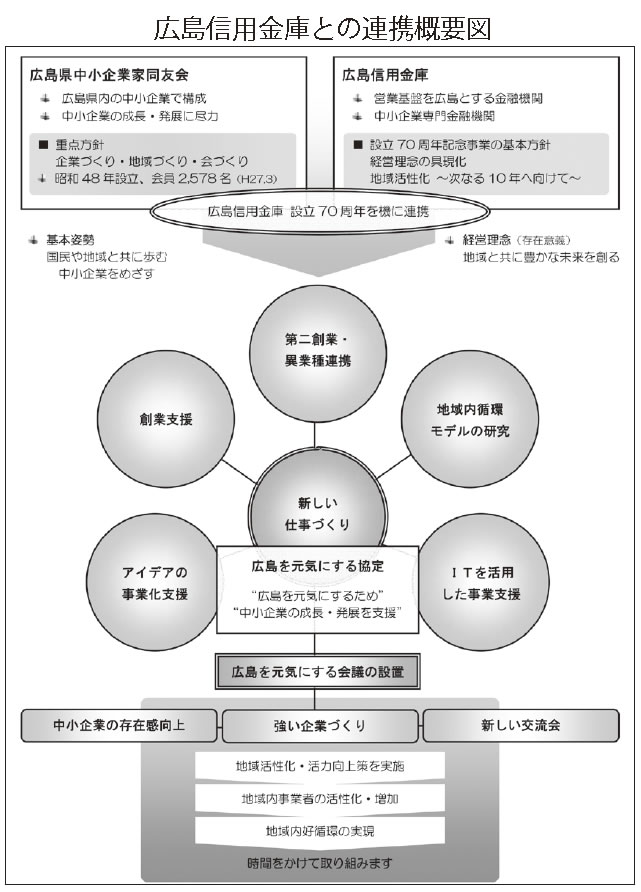 2015年5月、広島同友会は広島信用金庫と「広島を元気にする協定」を結びました。広島信用金庫から「創業70周年を機会に、地域とともに歩む金融機関として、地域を元気にするための活動を広島同友会と一緒にやりたい」との提案があり、広島同友会の基本姿勢は「国民や地域とともに歩む中小企業をめざす」であり、両者の基本的な考え方が一致、協定を結ぶことになったものです。