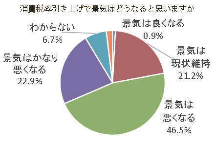 まず、「消費税率引き上げで、景気はどうなると予想されますか」について、「景気が悪くなる」が46.5%、「景気がかなり悪くなる」が22.9%と実に約7割が消費税率引き上げで景気の悪化を予想。逆に「景気が良くなる」が0.9%と1%も満たず、「景気は現状維持」は21.2%となりました。