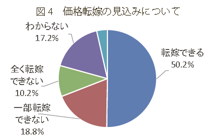 消費税率引き上げ後の価格転嫁の見込みについては、「全く転嫁できない」が10.2%と約1割、「一部転嫁できない」が18.8%と約2割になり、約3割が消費税を転嫁できないと回答しました。(図4)