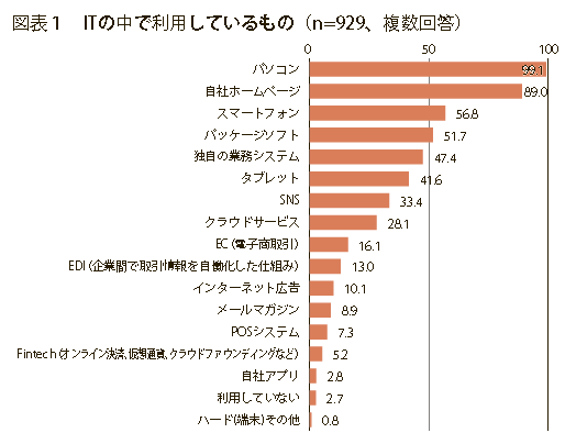 下位をみると、「ハード(端末)その他」0.8%、「利用していない」2.7%、「自社アプリ」2.8%、「Fintech(オンライン決済、仮想通貨、クラウドファウンディングなど)」5.2%、「POSシステム」7.3%、「メールマガジン」8.9%、「インターネット広告」10.1%となっています。(図表1)