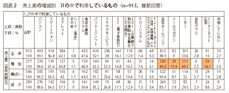 図表2をみると、「SNS」を活用していると回答した会員企業は、前年同期と比べて売上高が増加した割合が多いことがわかります。そのほかにも、「自社ホームページ」、「メールマガジン」、「インターネット広告」といった項目にも関しても同じことがいえます。