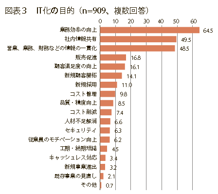 設問2(複数回答)の「IT化の目的」では、上位から「業務効率の向上」64.5%、「社内情報共有」49.5%、「営業、業務、財務などの情報の一貫化」48.5%、「販売促進」16.8%、「顧客満足度の向上」16.1%、「新規顧客開拓」14.1%、「新規採用」11%となっています。
