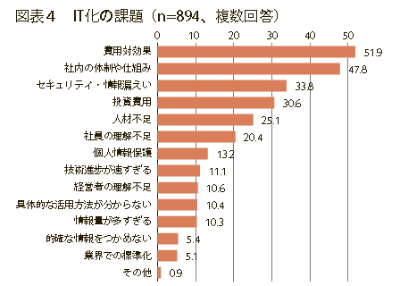下位をみると、「その他」0.9%、「業界での標準化」5.1%、「的確な情報をつかめない」5.4%、「情報量が多すぎる」10.3%、「具体的な活用方法がわからない」10.4%、「経営者の理解不足」10.6%、「技術進歩が速すぎる」11.1%となっています。(図表4)