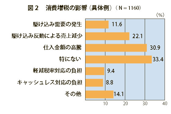 具体的な影響としては、「駆け込み需要の発生」は11.6%と少ない一方、「仕入金額の高騰」は30.9%、「駆け込み反動による売上減少」は22.1%とマイナスの影響が多くなっています。「特にない」は33.4%でした。(図2)