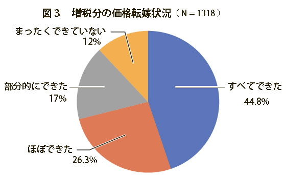 増税分の販売価格への転嫁については、「すべてできた」と回答した企業は44.8%に留まっており、55%以上の企業が何らかの形で自社負担している現状となっています。(図3)