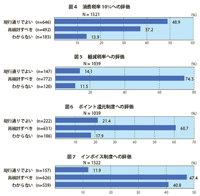消費税率10%、軽減税率、ポイント還元制度、インボイス制度への評価について尋ねたところ、消費税率10%については「現行通りでよい」48.9%、「再検討すべき」37.2%と分かれました。しかし、記述回答に着目してみると「やむを得ない」「仕方ない」などの消極的な肯定意見も目立ちました。