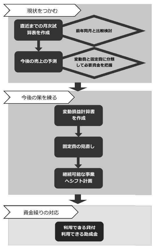 同会の「新型コロナウイルス感染症対策ニュースVol・5」(A4判4ページ)に紹介された「『経営計画の見直し』の考え方と手順」は、「現状を掴む」「今後の策を練る」「資金繰りの対応」の3つから構成(図)。分かりやすく図解され、自社の財務状況を把握し、必要資金や計画の見直しが明確にできるように作られています。