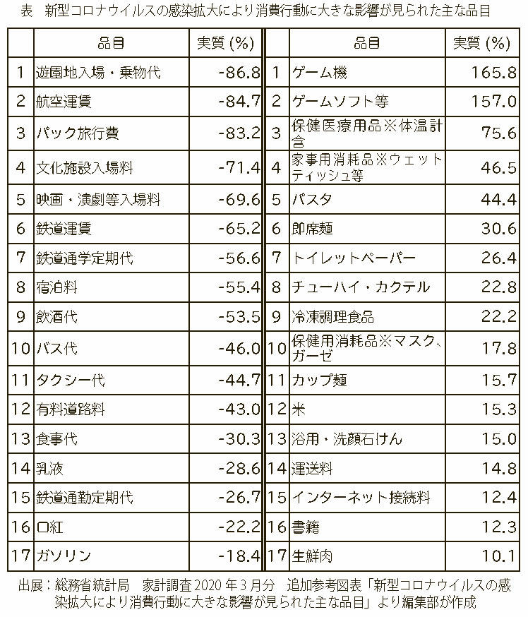 逆に増加した品目を見てみますと、ゲーム機が165.8%やゲームソフトが157.0%などとなっており、自宅での娯楽の消費支出が大幅に増加。また体温計、ウェットティッシュ、マスク、ガーゼの衛生用品・消耗品、自宅での食事が増加し、パスタ、即席麺、冷凍食品などの増加も目立ちます。