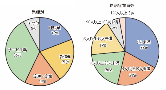 業種別 / 建設業19%、製造業21%、流通商業17%、サービス業35%、その他8%
