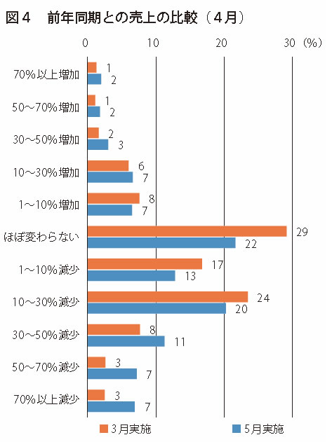 4月の前年同月対比の売上は58%の企業が「減少」と回答しました。3月調査と比較すると「ほぼ変わらない」と回答した企業割合の減少ポイントがそのまま「減少」に移行したとみられます。とりわけ3割以上減と回答した企業が11ポイント増(14%→25%)となり、時間とともに深刻な影響が広がっていることも予想され、懸念されるところです。(図4)