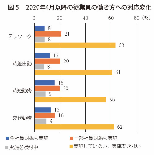 4月以降、約3割の企業でテレワークや時差出勤、時短勤務、交代勤務を実施(全社員・一部社員対象含む)、約1割の企業で実施を検討しています。(図5)