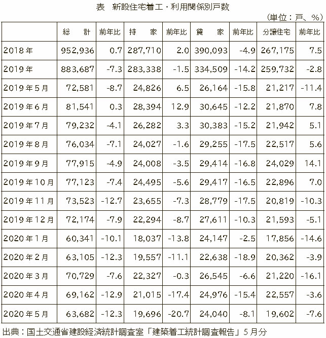 5月分の状況を詳しく見てみると、持家では1万9,696戸(同20.7%減)10カ月連続で減少。貸家は2万4,040戸(同8.1%減)21カ月連続で減少。分譲住宅は1万9,602戸(同7.6%減)7カ月連続で減少しています。(表)