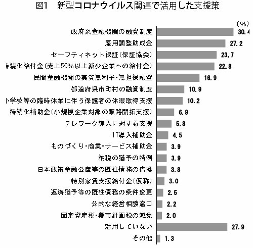 オプション調査の1問目の、「新型コロナウイルスに関連した支援策で活用したものはありますか」に対して、有効回答数十68社のうち、「政府系金融機関の融資制度」30・4% が最も多く、「雇用調整助成金」27・2%、「セーフティネット保証(保証協会)」23・7%、「持続化給付金(売上50%以上減少企業への給付金)」22・8%、「民間金融機関の実質無利子・無担保」16・9%の順となっている。一方、「活用していない」とする回答が27・9%もあり、回答件数は2番目に多い結果となっているのは気がかりである。(図1)