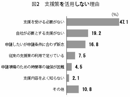 次に、前出の質問において、「活用していない」と回答した企業へのその理由を問うた結果は、「支援を受ける必要がない」47・1%、「自社が必要とする支援がない(自社が求める支援がない)」19・2%、「申請したいが申請条件に合わず断念」16・8%、「従来の支援策の利用で足りている」7・5%、「申請準備のための時間等の確保が困難」4・5%となった(図2)。