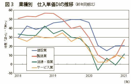 仕入単価DI、売上・客単価DI(両指標ともに「上昇」-「下降」割合、9→17、△2→1)の動きを見ると、仕入単価の急上昇が採算圧迫要因の1つとみられます。製造業と流通・商業で上昇し、特に製造業では9→28と際立っています。次期は売上・客単価を上回る速度で仕入単価が上昇するとの見方が強く、価格管理にはいっそうの注意が求められます。(図3)