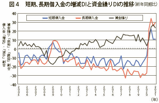 ただし、昨春のコロナ禍の緊急融資を受けてから1年が経過し、資金繰りに対する懸念も大きくなっているなど、今後の金融環境、資金繰りの動向に注意が必要です(図4)。