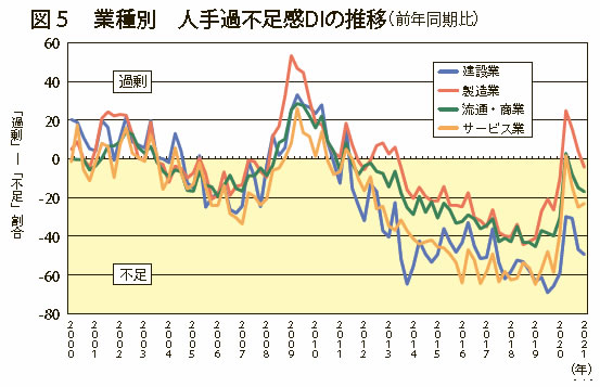 人手の過不足感DIは全業種で不足超過となりましたが、業種間で不足の度合いは異なっています。(図5)