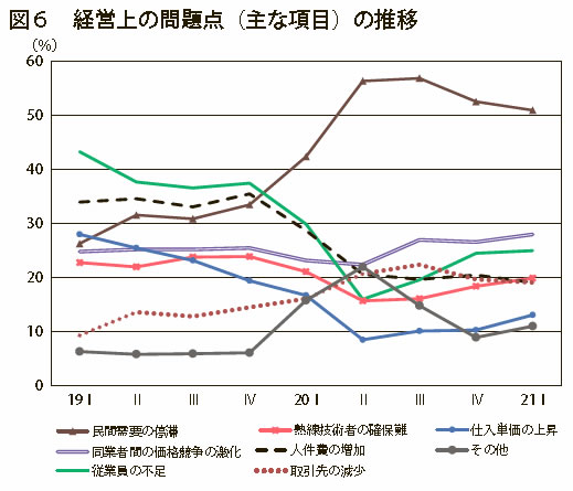 経営上の問題点では「民間需要の停滞」が4期連続で50%を上回っています。指摘される上位項目の回答割合に大きな変化はありませんが、製造業の仕入単価DIの急上昇と連動して「仕入単価の上昇」の指摘割合の増加も目立ちました(12%→21%)。全業種(13%)よりも8ポイント高く、経営課題として強く意識されているようです。(図6)