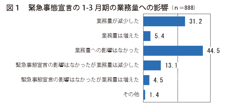 このアンケート調査では、「緊急事態宣言は、(2021年)1~3月期の貴社の業務量にどのような影響を与えましたか」として、業務量への影響を聞いている(図1)。その結果は次のとおりである。「業務量への影響はなかった」(44・5%)が最も高く、次いで「業務量が減少した」(31・2%)、「緊急事態宣言の影響はなかったが業務量は減少した」(13・1%)となっている。「業務量は増えた」(5・4%)、「緊急事態宣言の影響はなかったが業務量は増えた」(4・5%)と、業務量が増えたという回答はいずれも低い。
