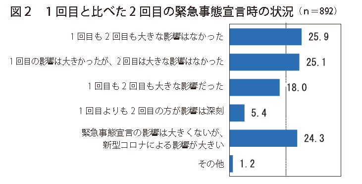 その結果を見ると、上位3項目までが、およそ同程度の割合で並んでいることがわかる。「1回目も2回目も大きな影響はなかった」(25・9%)、「1回目の影響は大きかったが、2回目は大きな影響はなかった」(25・1%)、「緊急事態宣言の影響は大きくないが、新型コロナウイルスによる景気の影響が大きい」(24・3%)の3つである。