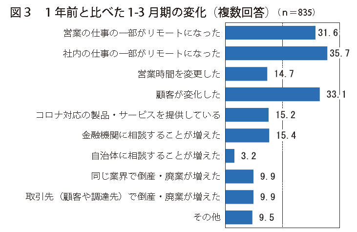 1年前と比べて変化したことは、「社内の仕事の一部がリモートになった」(35・7%)が最も高い。次いで、「顧客が変化した」(33・1%)、「営業の仕事の一部がリモートになった」(31・6%)となっている。この1年の間に、社内の業務にとどまらず、顧客や社外との取引などについても大きく変化をし、ポストコロナ、ウィズコロナ社会への対応を進めていることがわかる。