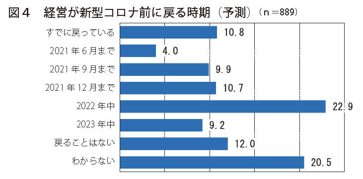 同調査では、「貴社の経営が新型コロナウイルス前に戻る時期についてどのようにお考えですか」ということも聞いている。この結果は次のとおりである(図4)。