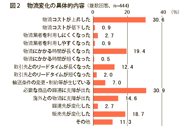 図2は、新型コロナウイルス感染症の流行によって物流にどのような影響が生じたかについて調査したものです。割合が高い順に、「必要な商品の調達に支障が出た」(30・9%)、「物流コストが上昇した」(30・6%)、「物流にかかる時間が長くなった」(19・4%)、「販売先が変化した」(18・7%)、「海外との物流に支障が出た」(14・6%)という結果でした。