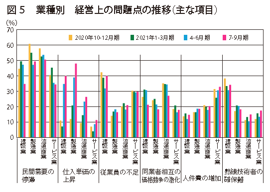 原材料価格の高騰などの影響により、経営上の問題点として「仕入単価の上昇」を挙げる割合が上昇し続けています(13%→27%→33%)。また、「仕入先からの値上げの要請」も連動して上昇しています。特に建設業と製造業でその傾向が顕著です(図5)。