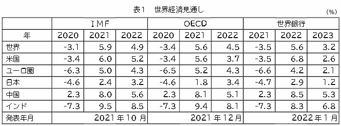 世界経済見通しは、10月のIMF見通しでは新型コロナ感染症で急減した2020年の世界のGDPが▲3.1%から21年に5.9%まで回復し、22年も4.9%としています(最新は1月25日発表予定)。12月のOECDの見通しも同じく、20年は▲3.4%から21年は5.6%と回復し、22年も4.5%に成長と予測。オミクロン株の感染急拡大でも経済再開の動きは続くと見ています。(表1)