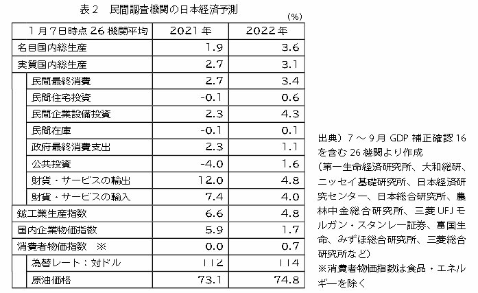 日本経済の見通しは、20年は▲4.6%、21年ではIMFは2.4%、OECDは1.8%と見ており、民間調査機関は平均2.7%と戻しきれていない中で、22年にはそれぞれ3.2%、3.4%、3.1%と、コロナ前水準に戻ると予想されています。しかし当初の21年10~12月に19年水準に戻す予想が22年にずれ込んだ上、オミクロン株の感染が1月に急拡大したことで、1~3月もマイナス予想への転換見込みであり、19年水準に戻るのは23年10~12月まで遅れると予想されます。