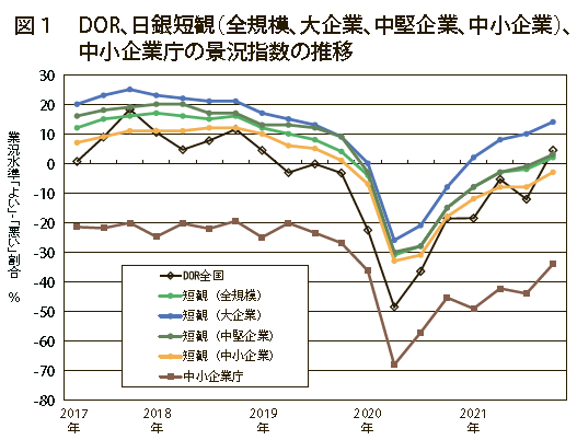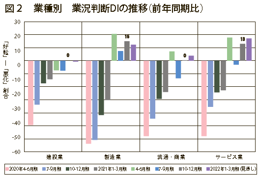 業況判断DIを業種別で見ると、建設業は△8→0、製造業は7→15、流通・商業は△13→0、サービス業は△3→13と全業種でマイナス圏から脱しました(図2)。また、多くの地域経済圏、企業規模でも好転傾向が見られましたが、次期(2022年1~3月期)は今期同様の水準、もしくは悪化の見通しとなっています。