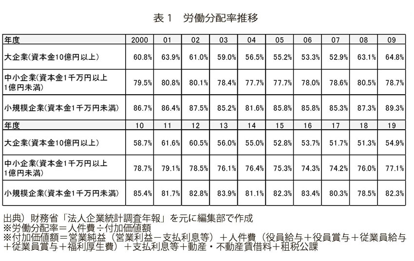 非正規の増加が主に賃金低下の原因であると同時に、配当金増加と内部留保増加が賃金の低下を招いています。労働分配率の長期統計を企業規模別で見るとはっきりしますが、コロナの影響に配慮して2000年度から2019年度にかけて大企業が60.8%から54.9%に5.9%減少、中堅(表略)は71.2%から67.8%に3.4%減少、中小企業は79.5%から77.1%に2.4%減少、小規模企業は86.7%から82.3%に4.4%減で、大企業の減少率が最も大きく、中小企業との差が22.2%もあります(表1)。