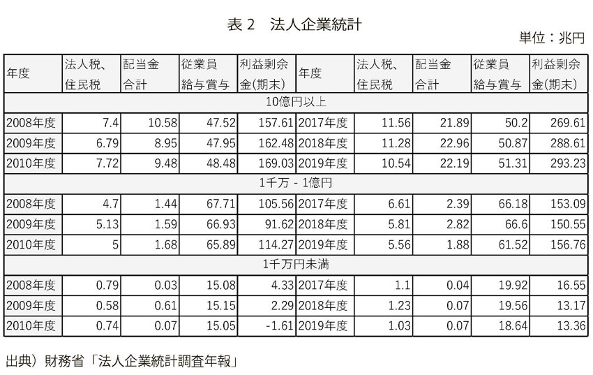 また法人企業統計の特徴部分を2008年度から2019年度で見ると、従業員給与・賞与では小規模企業が29万社増の影響で15兆円から18兆円と3兆円増加、中小企業は20万社減の影響で67兆円から61兆円に少し減少、大企業も500社減ですが47兆円から51兆円と4兆円近く微増でほとんど変わっていません。法人税や住民税なども小規模企業から大企業まで微増とあまり変わっていないのに対して大きく増えているものがあります。1つは中間配当と期末配当を合わせた配当金合計が中小企業で4,000億円増、小規模企業で400億円と微増なのに対して、大企業が10兆5,800億円から22兆1,900億円と11兆6,100億円も増やしています(給与増の3倍分)。内部留保と言われる期末の利益剰余金が小規模企業で9兆円、中小企業でも50兆円増加ですが、大企業で135兆6,200億円も増加(給与増の30倍以上)しています(表2)。