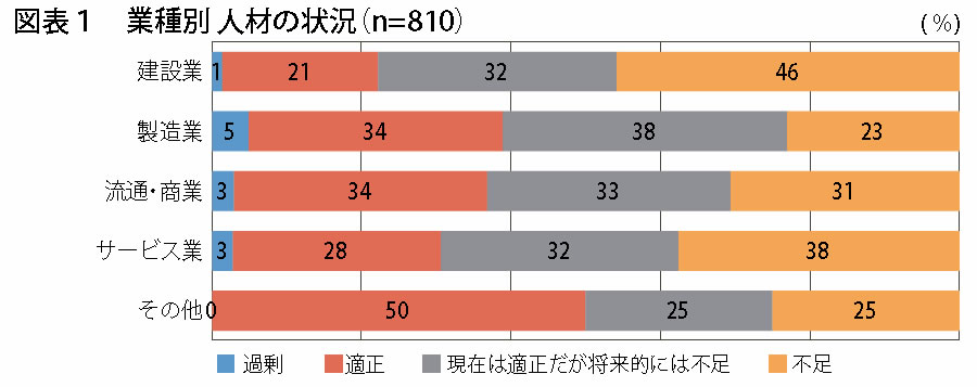 各種調査やこれまでのDOR調査でも示されているように、建設業とサービス業で特に人材不足に悩まされていますが、今回の調査でもそのような結果となっています。「不足」「現在は適正だが将来的には不足」を合わせて建設業では8割近く、サービス業ではほぼ7割となっています。ただし、注意すべきは他の業種でも人材不足状況は深刻化するであろうということです。製造業も人材不足であることに変わりありませんが、これまでのDOR調査では建設業やサービス業と比較していくぶんかポイントが低い状況でした。しかし、「現在は適正だが将来的には不足」は製造業が最も高く38%となっています(図表1)。