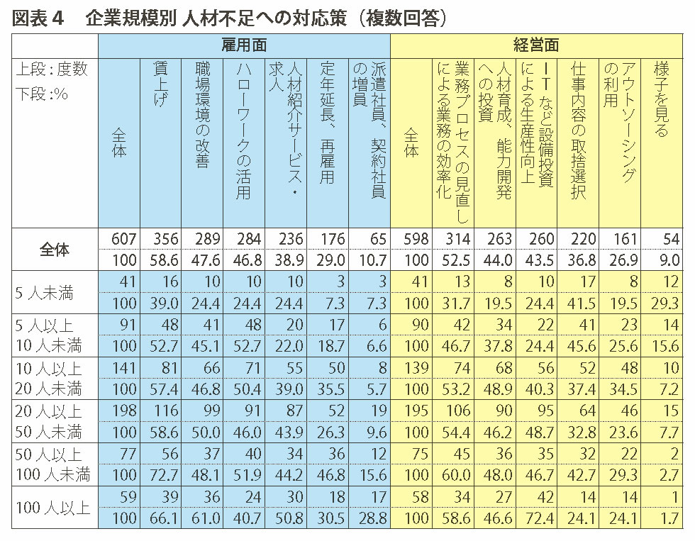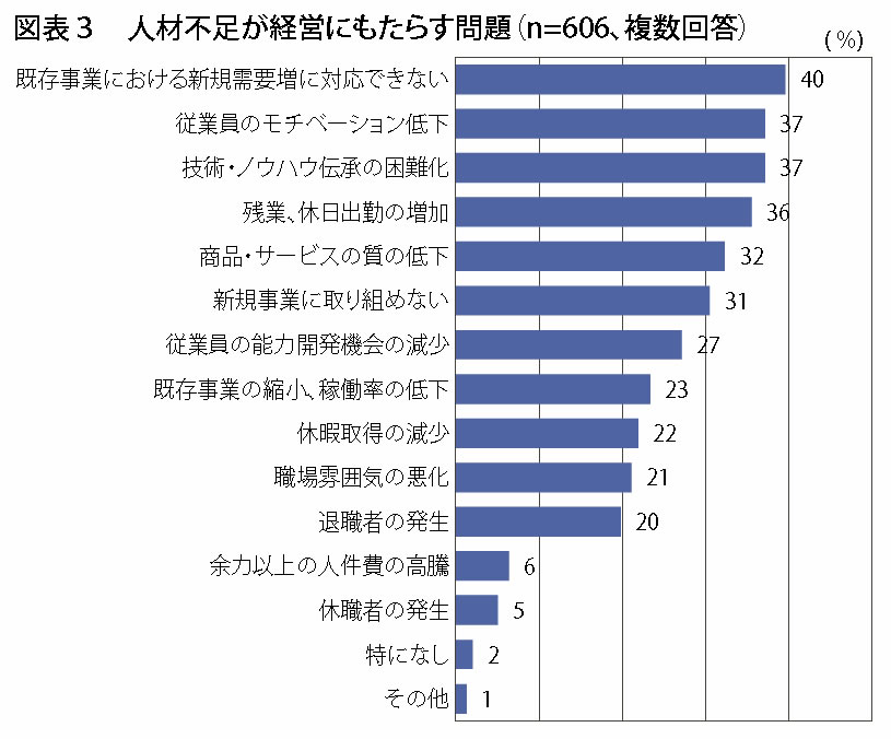 経営にもたらす問題では「既存事業における新規需要増に対応できない」、「従業員のモチベーション低下」、「技術・ノウハウ伝承の困難化」、「残業、休日出勤の増加」に回答が集中しています(図表3)。ここからは人材不足下で新規需要に対応するために残業、休日出勤が増加し、そのために従業員のモチベーションが低下しているというような連鎖が考えられ、その中で技術・ノウハウを伝承する余裕も人もなくなっていると考えられます。残業、休日出勤の増加と従業員のモチベーション低下は特に規模が大きい企業ほど見られます。また、従業員のモチベーション低下はさらに「商品・サービスの質の低下」にもつながると考えられ、特に流通・商業、サービス業の5人未満では顕著です。