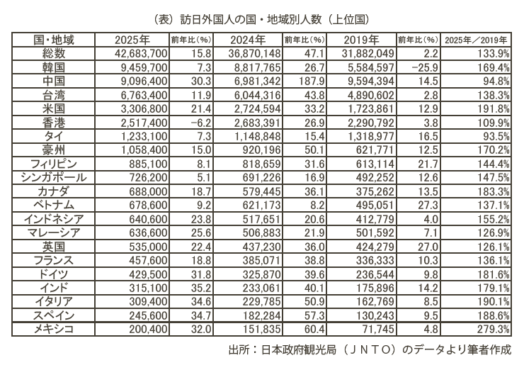 ただし、月別で見ると、中国の日本への渡航自粛要請で、中国からの訪日は2025年12月に45・3%減、2026年1月には60・7%減と大幅に減少しました。一方で、コロナ前に比べると、中国とタイ以外の国は伸びています。2025年の訪日外国人数について、20万人以上の上位21カ国を対象に、コロナ前の2019年と2024年と比較すると(表参照)、中国とタイ以外は全てコロナ前を上回りました。